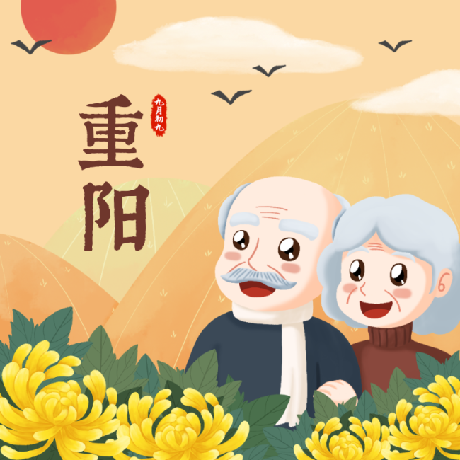 中国传统节日重阳节黄色手绘插画菊花老人